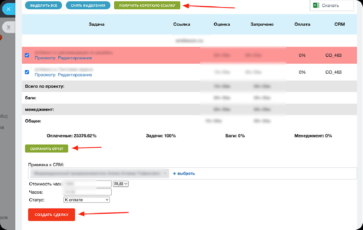 Отчет формировался по заданным параметрам: период, проект, тип задач, статус, процент оплаты. После согласования формировалась ссылка для клиента, создавались документы и выставлялась сделка.