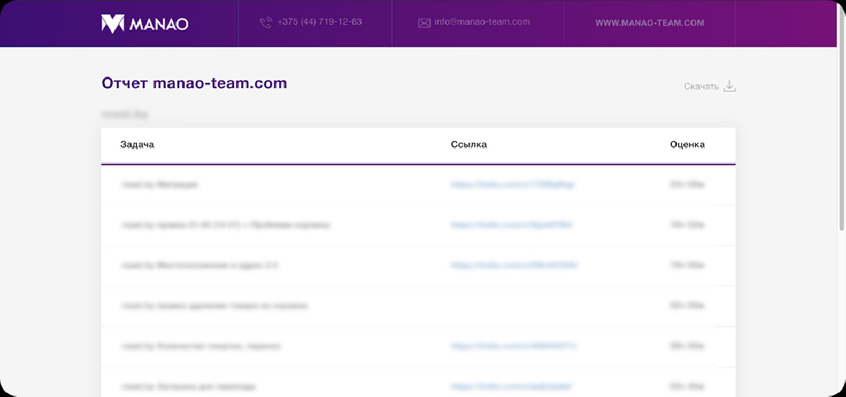 Клиент получает брендированную страницу отчета с детализацией работ и ссылками на задачи.