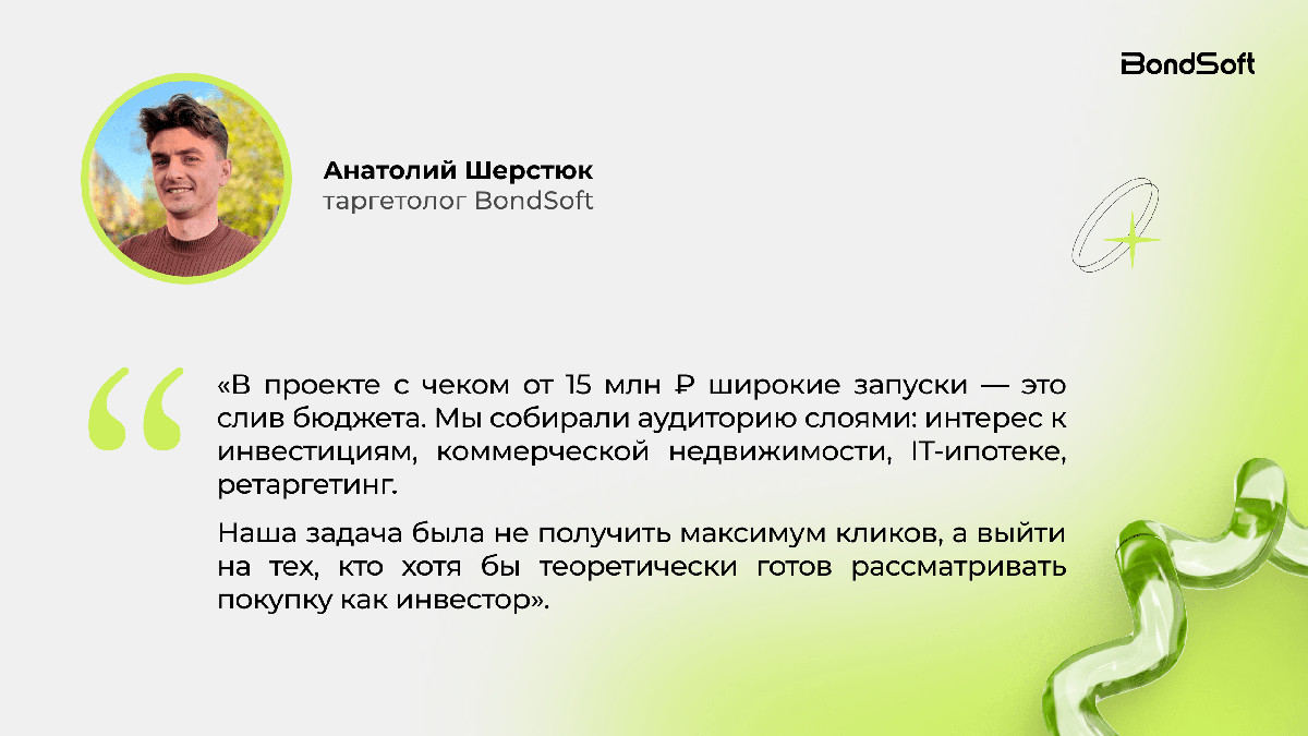Стандартная реклама новостроек приводила бы нерелевантный трафик и дорогие лиды. Продукт ориентирован на инвесторов, поэтому требовалась стратегия, работающая не на охваты, а на возврат вложений и качество заявок.