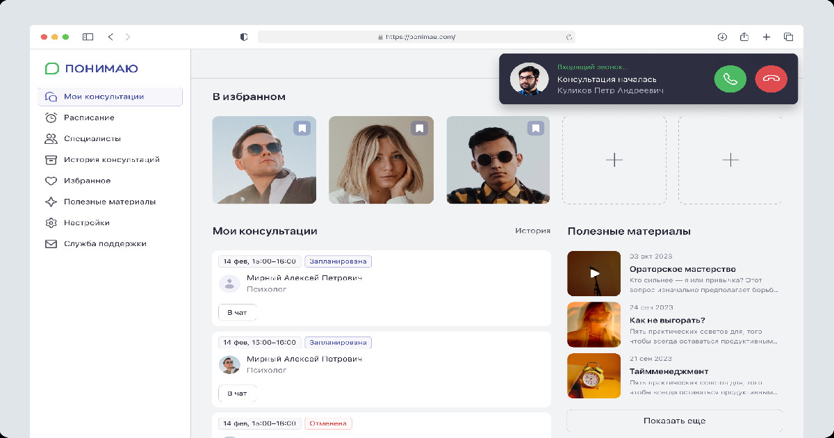 Платформа «Понимаю» — сервис онлайн-помощи для корпоративных клиентов с упором на безопасность и видеосвязь. Её используют СДЭК, Авито и Сбербанк для доступа сотрудников к психологам и другим специалистам. Проект вырос в масштабируемую экосистему с веб- и мобильными приложениями и платежами.