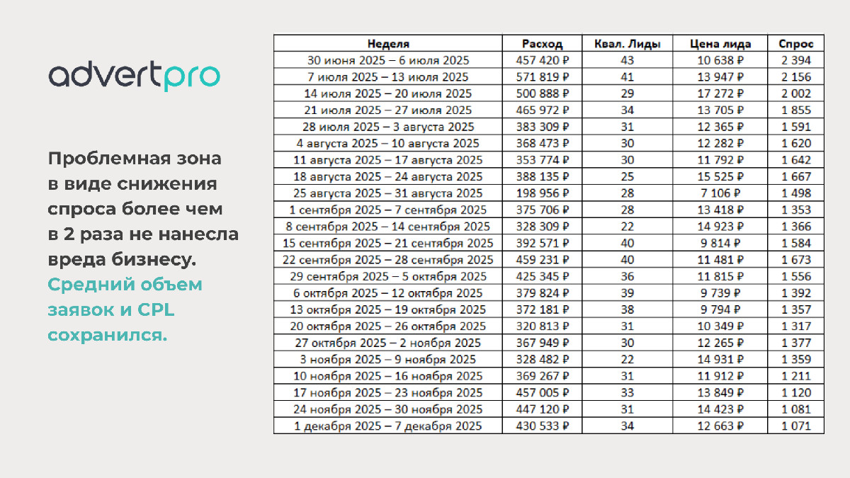 Сохранить текущие показатели по объему лидов и цене лида (CPL) с учетом объективного снижения сезонного спроса. Другими словами — сделать так, чтобы бизнес прошел «низкий сезон» без потерь в рекламной эффективности, сохранив поток заявок для отдела продаж.