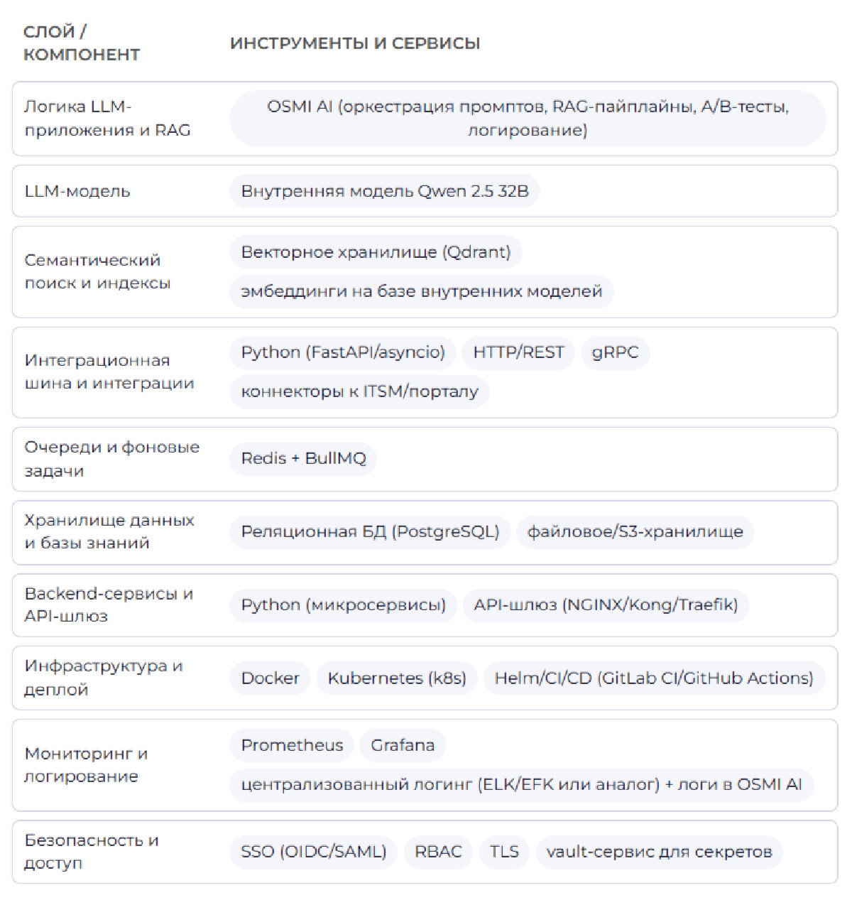 - Настроить контур валидации ответов экспертами, сбор фидбэка и дообучение моделей; автоматическое пополнение базы знаний; внедрить контроль доступа к данным, аудит действий агента и требования по инфобезопасности.