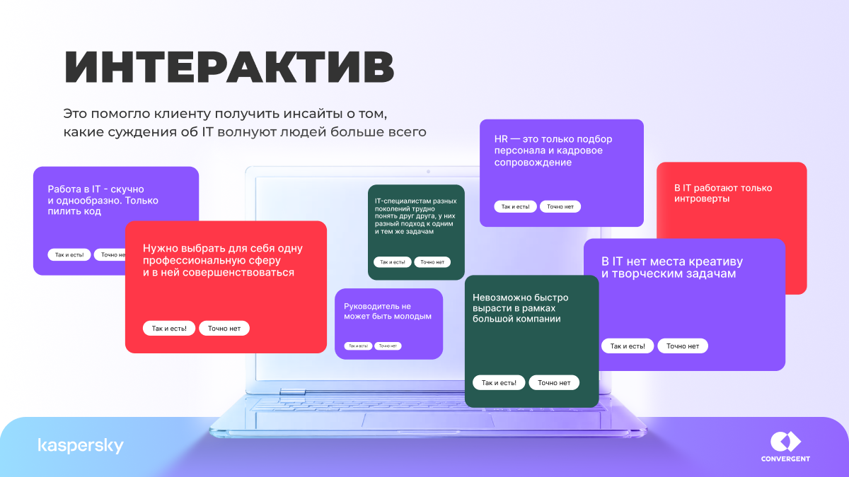 Агентство Convergent разработало интерактивный HR-спецпроект для «Лаборатории Касперского»: лендинг с 16 ИТ-стереотипами, которые опровергают реальные сотрудники компании. Полный цикл: креативная концепция, копирайтинг, фотопродакшен, дизайн, 500+ рекламных баннеров.