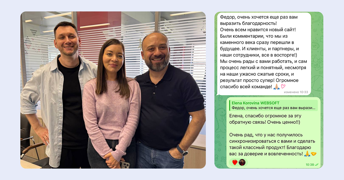 После завершения проекта мы спросили Елену — директора по маркетингу и PR Websoft, о том, что ей понравилось на этапе дизайна. Она прокомментировала нашу работу так: «Профессиональный подход к UX/UI — предложенные решения были не просто красивыми, но и функциональными. А современный дизайн повысил доверие к бренду при освещении в СМИ».