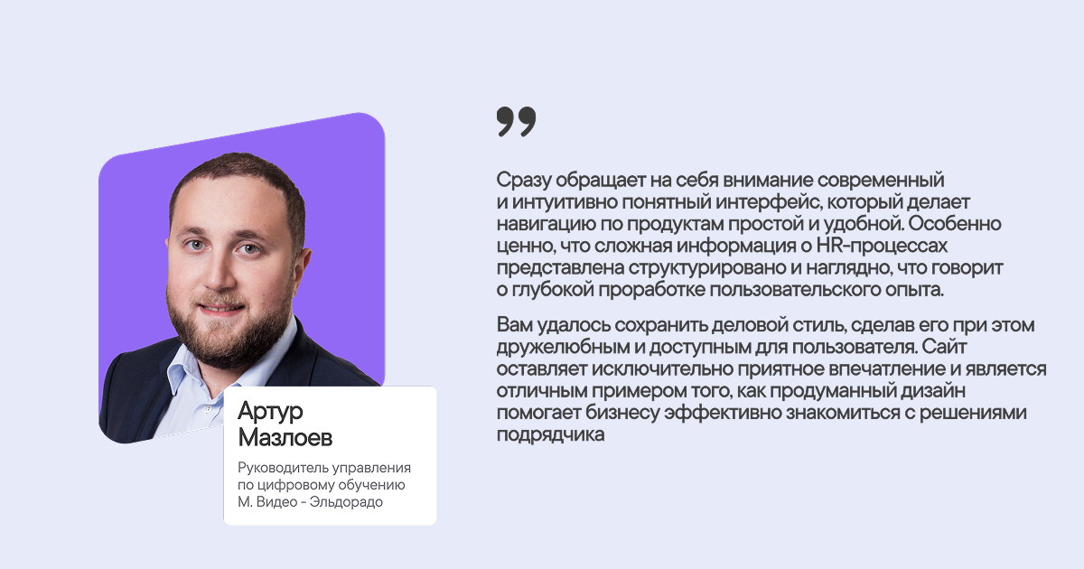 После проекта мы спросили Елену, что для нее было самым ценным в работе с нами. Она ответила: «Глубокое погружение в нашу специфику — вы действительно разобрались в том, что такое HR Tech и в нашей аудитории».