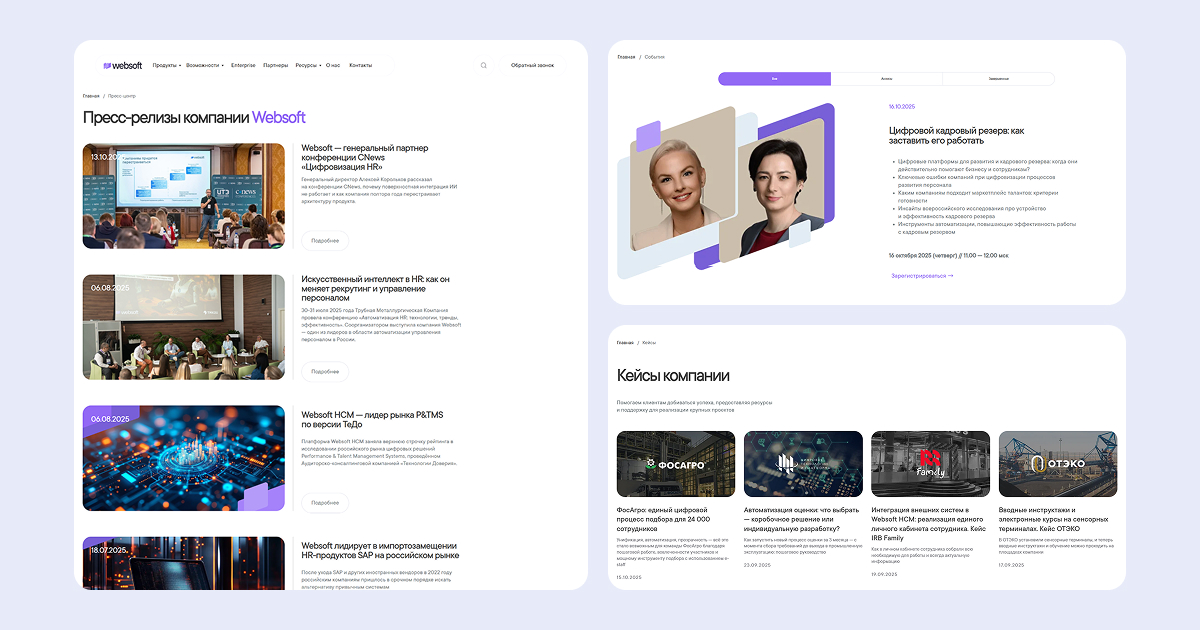 - В результате Websoft получил сайт, который отражает масштаб и экспертность компании, помогает выстраивать доверие с B2B-аудиторией, журналистами, жюри конкурсов и премий, и подчёркивает статус лидера в HR Tech.