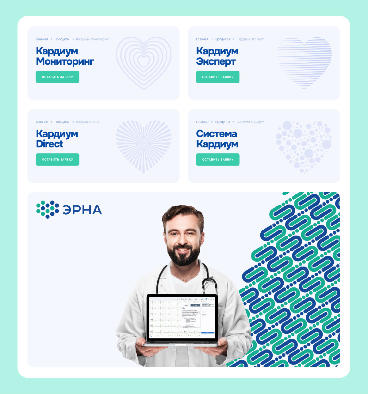 «Эрна» создает софт для медицинской диагностики. Нам нужно было визуально объяснить сложные IT-продукты и отстроить бренд от конкурентов. Мы освежили логотип, разработали систему паттернов и собрали на Tilda дружелюбный сайт, который генерирует лиды и работает на HR-бренд компании.
