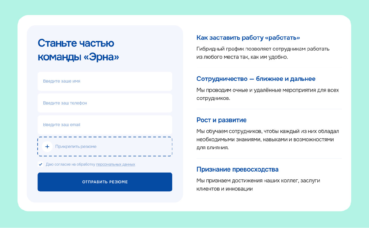 Поэтому мы заложили в сайт функцию рекрутинга: добавили блок с формой для отправки резюме, чтобы потенциальным сотрудникам было легко найти свое место в «Эрне».
