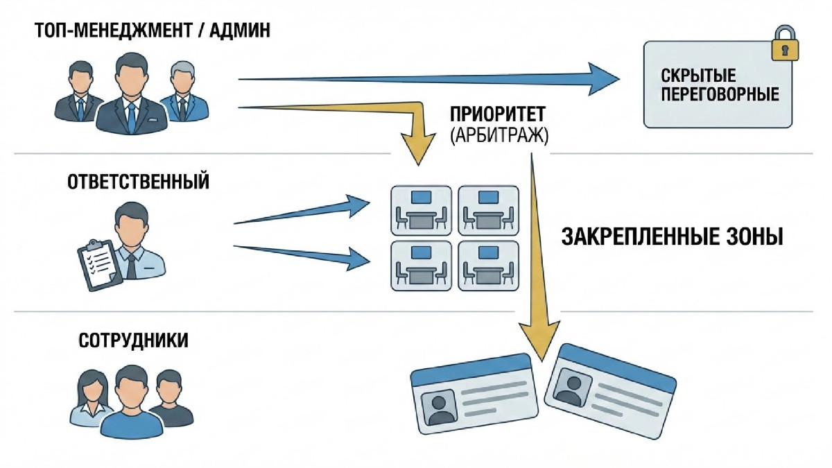 - Дали администраторам инструмент арбитража — возможность отклонять рядовые брони ради приоритетных встреч топ-менеджмента с обязательным указанием причины.