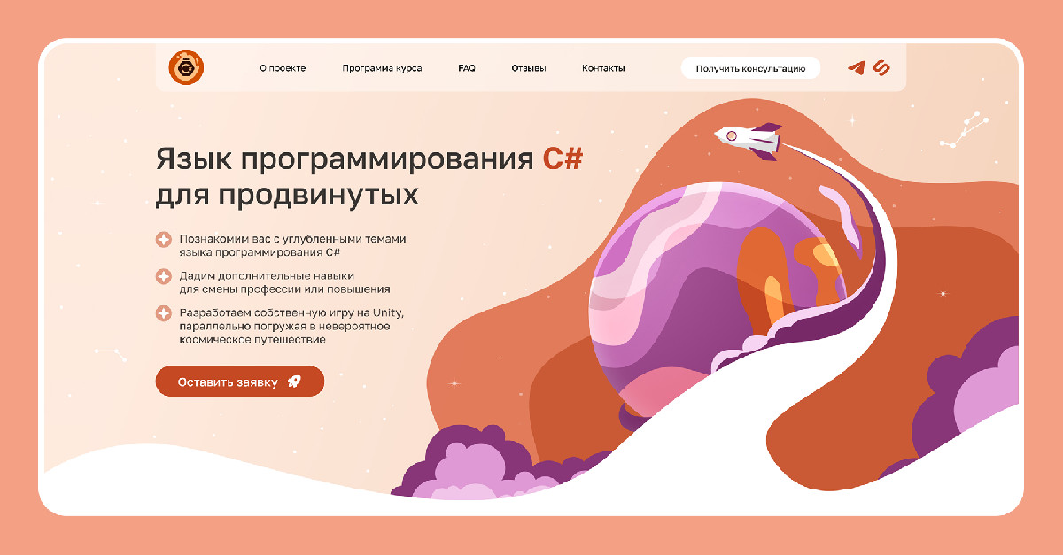 У курса по программированию не было сайта. Продавали на Stepik и через группу в ВК, но хотели масштабироваться. За 1.5 месяца собрали лендинг в космической комикс-стилистике с авторскими иллюстрациями и усилили преимущества курса. В этом кейсе – разбор дизайн- и UX-решений.