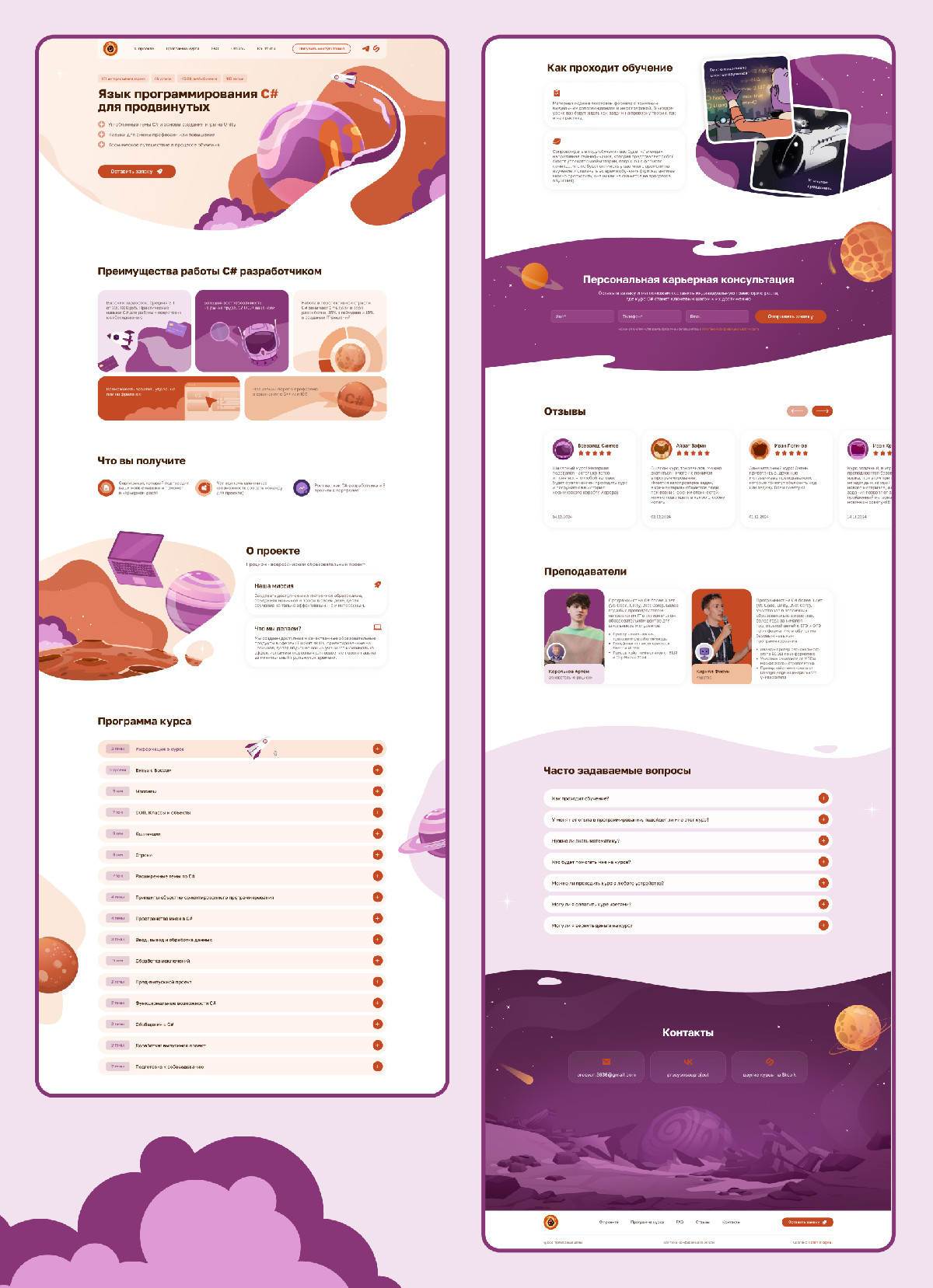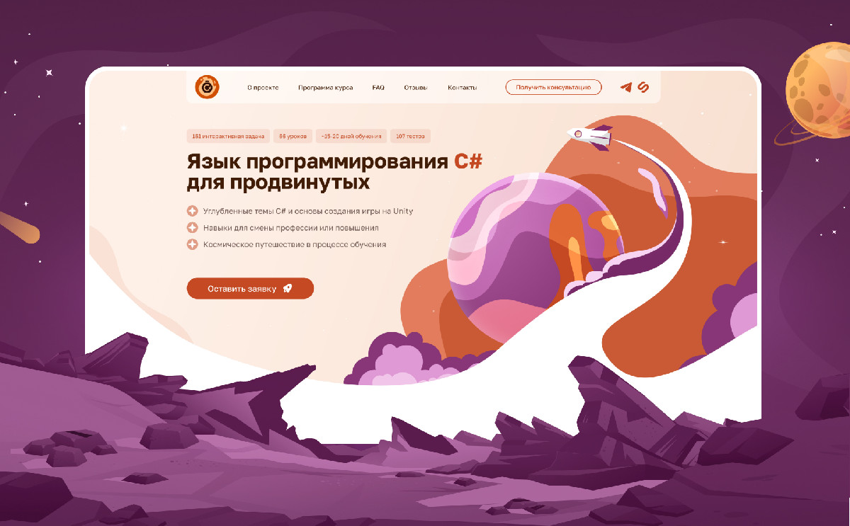 Команда завершила работу над лендингом примерно через 1,5 месяца после обращения. На выходе получилась посадочная, которая визуально совпадает с курсом: тот же комиксный космический язык, та же атмосфера, те же акценты на формате обучения.