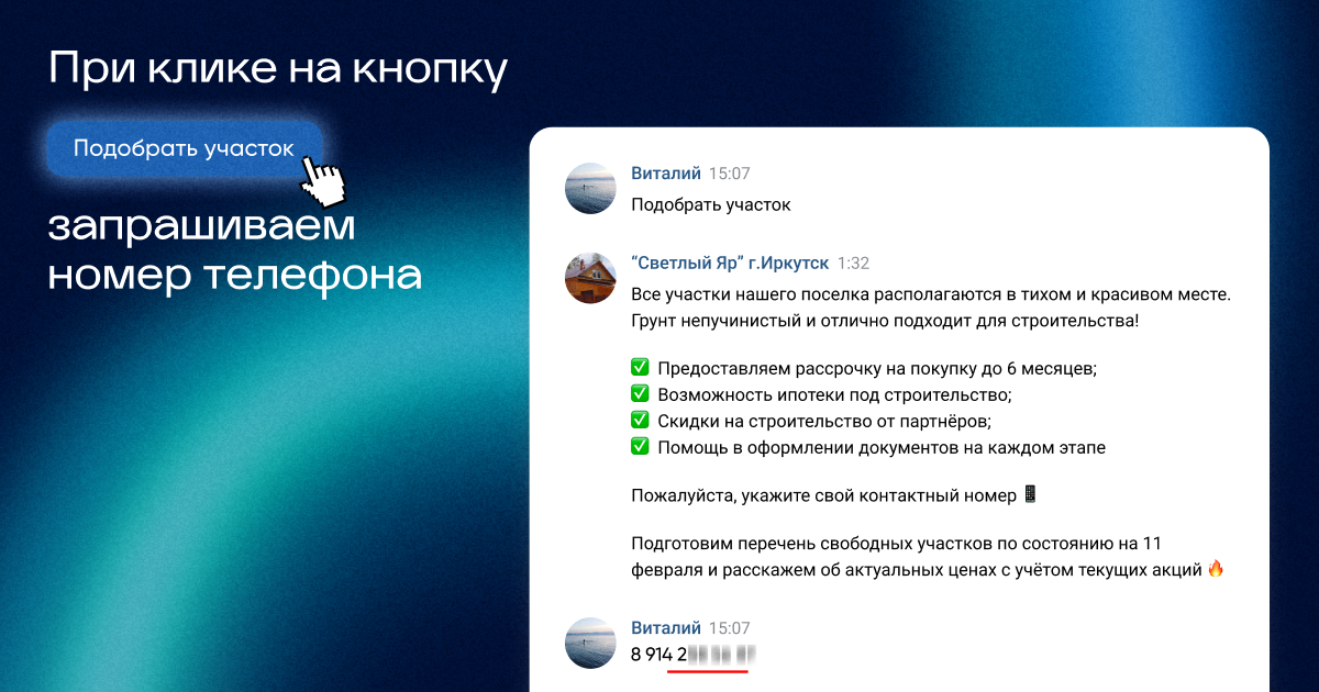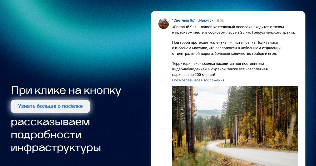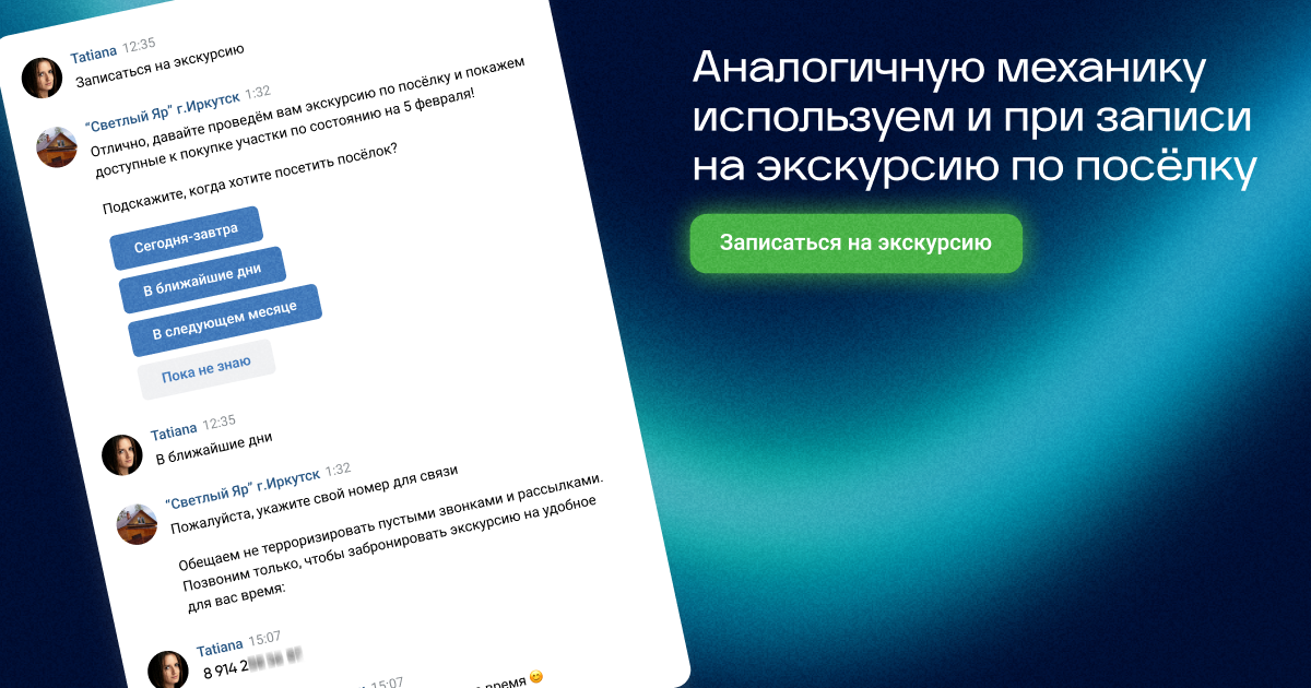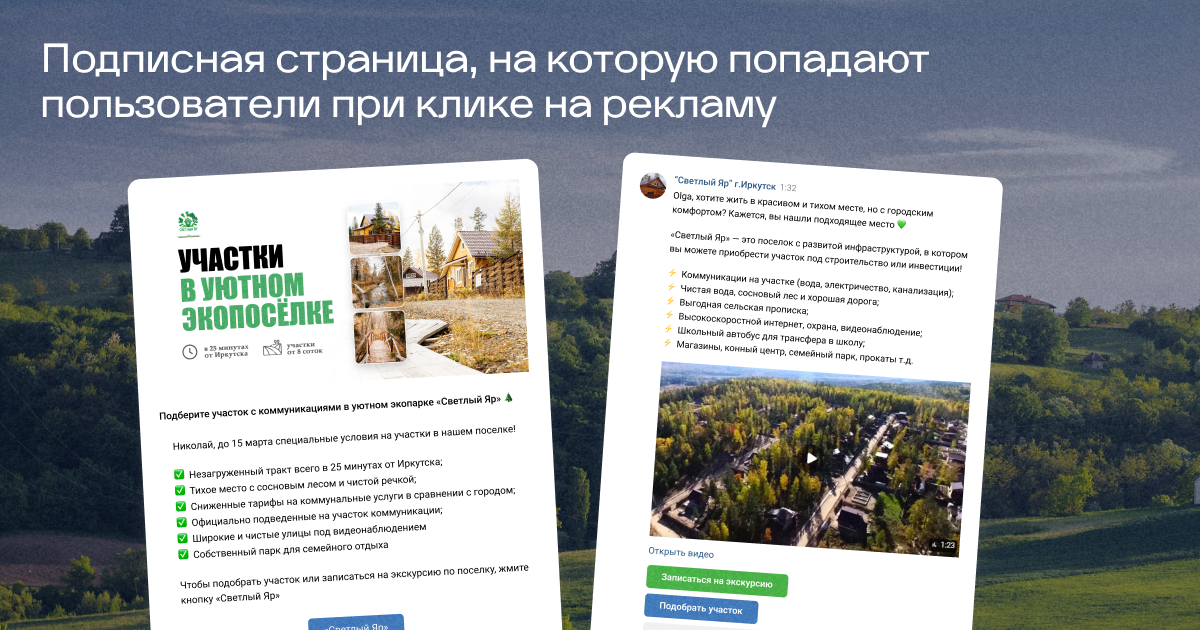 Так как решение о покупке земли не принимается за день, мы не вели трафик напрямую на сайт. Мы создали подписную страницу в VK с кнопками: «Узнать о посёлке», «Подобрать участок», «Запись на экскурсию». Бот автоматически собирал контакты при выборе услуги, а затем прогревал аудиторию через персонализированные рассылки.