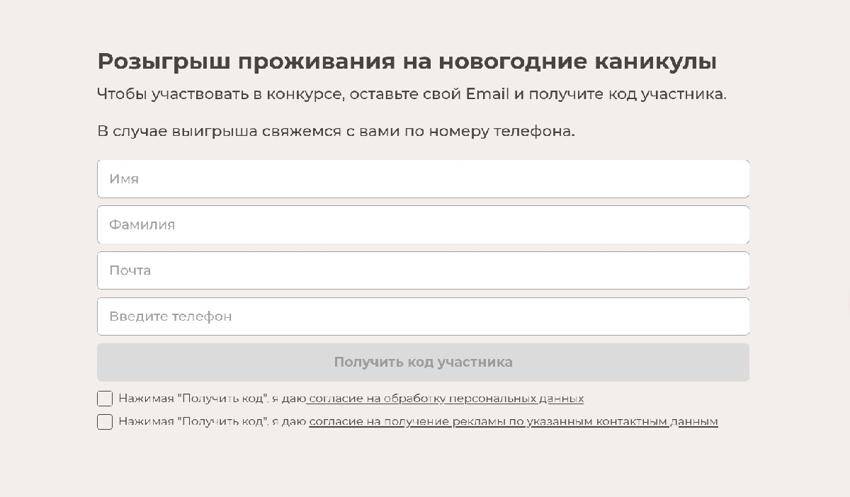 Практически весь трафик мы вели на посадочную страницу конкурса. На лендинге расписали условия и правила проведения розыгрыша. Разработали удобную форму сбора контактов. После заполнения информации и согласия на рассылки клиент получал письмо с уникальным номером для участия в розыгрыше.