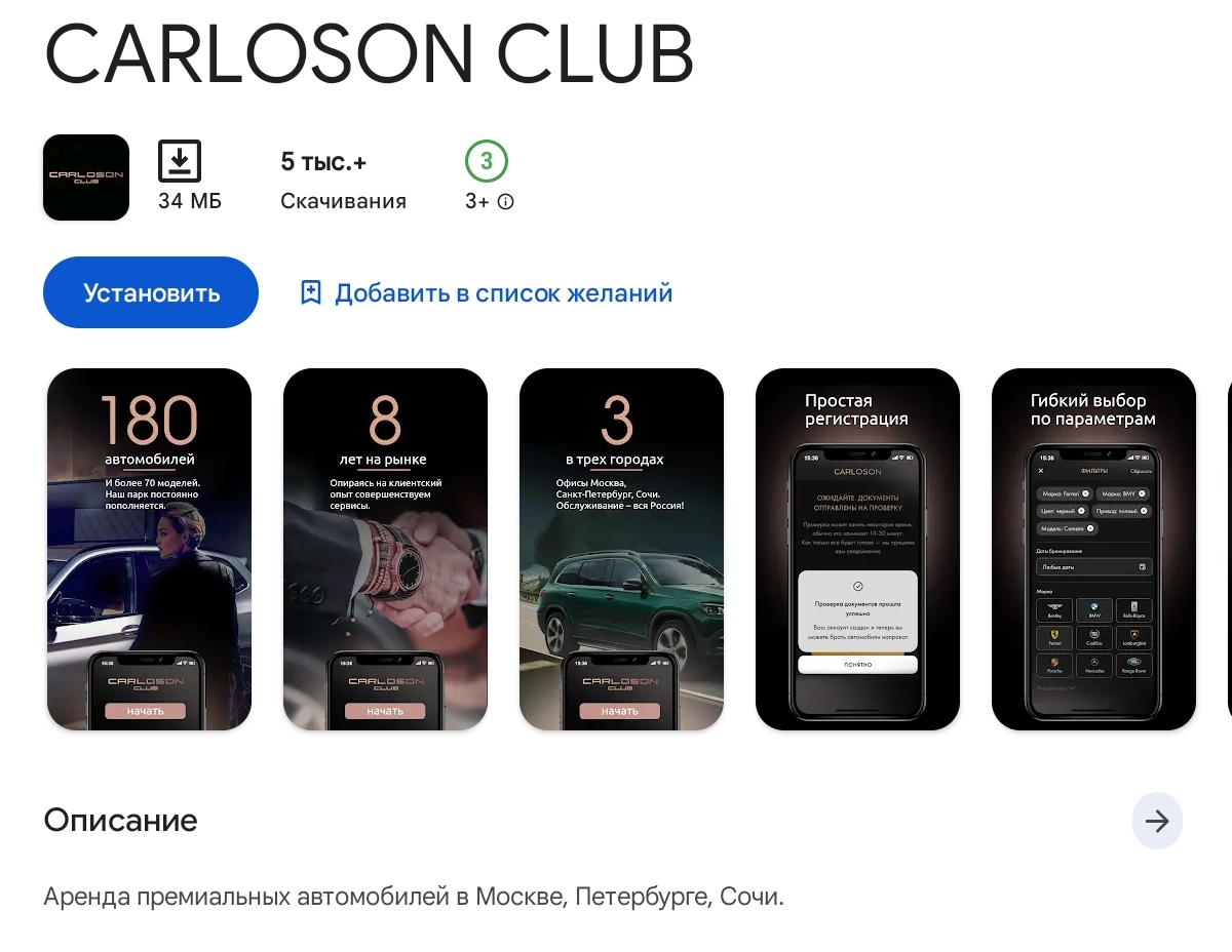 Карлосон Клуб (Carloson Club) — лидер на рынке проката эксклюзивных и премиальных автомобилей. Клиентам предоставляют европейский уровень сервиса. Компания фокусируется на создании незабываемого опыта вождения, предлагая более 200 вариантов люксовых автомобилей. Работает в Москве, Санкт-Петербурге, Сочи и Дубае.