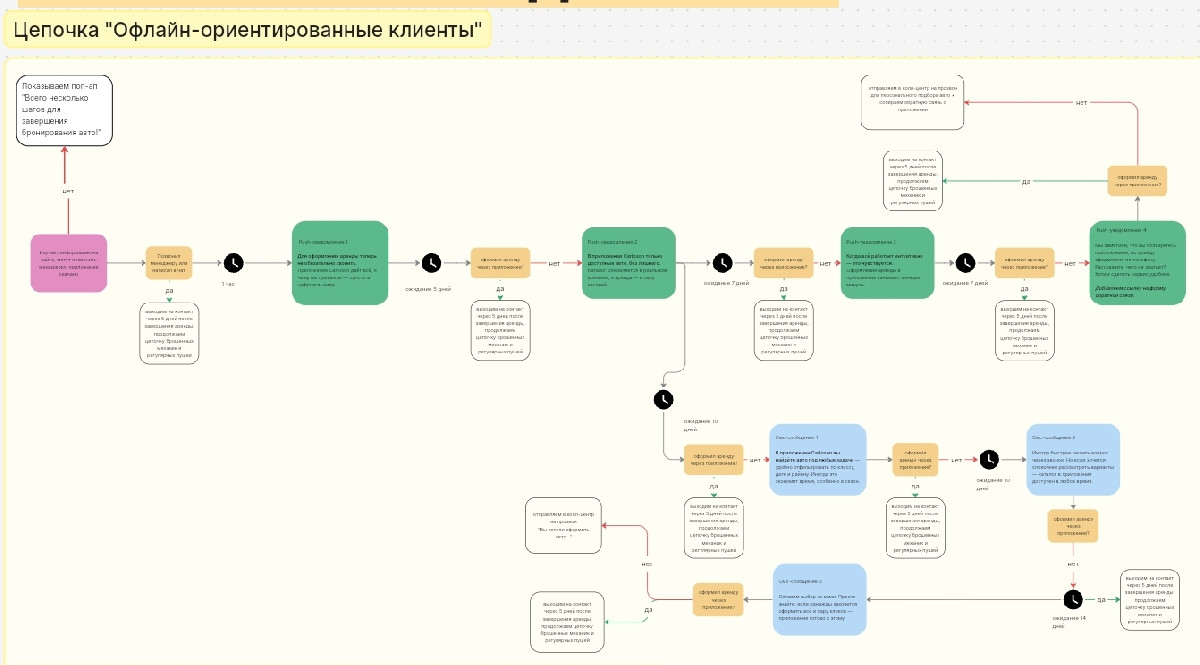 Например, цепочка «Офлайн-ориентированные клиенты» рассчитана на пять недель. В ней используются мобильные уведомления (push) с призывами арендовать авто через приложение и точечные СМС-коммуникации с описанием выгод мобильного приложения.