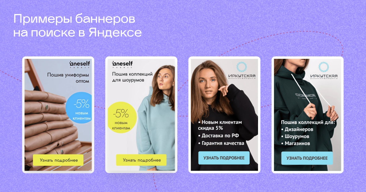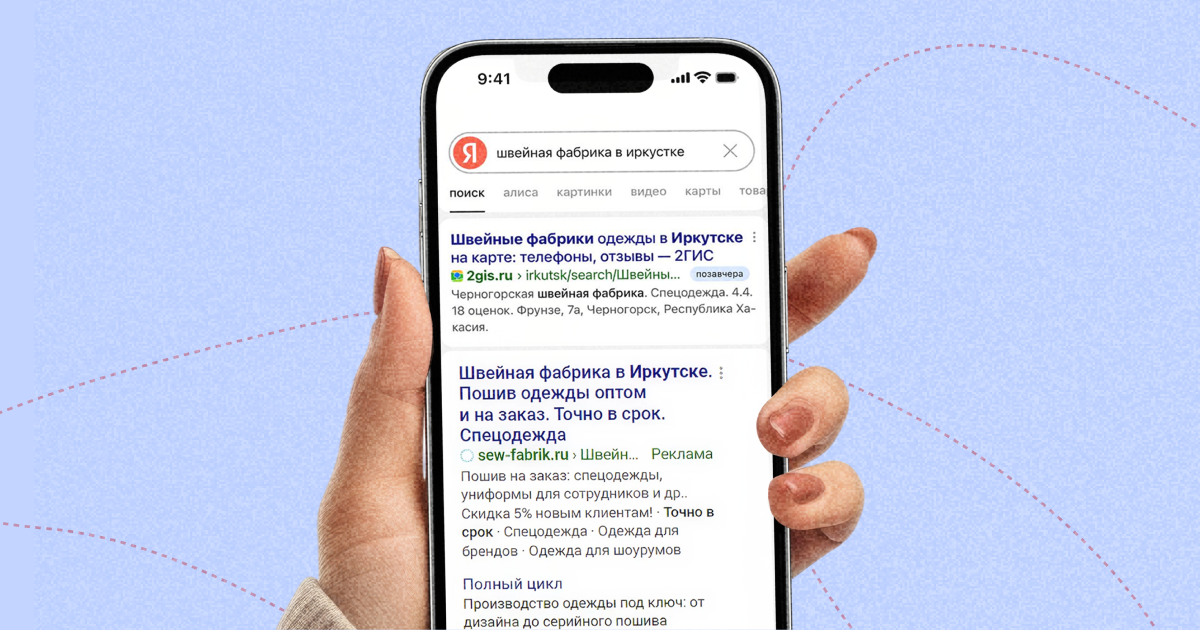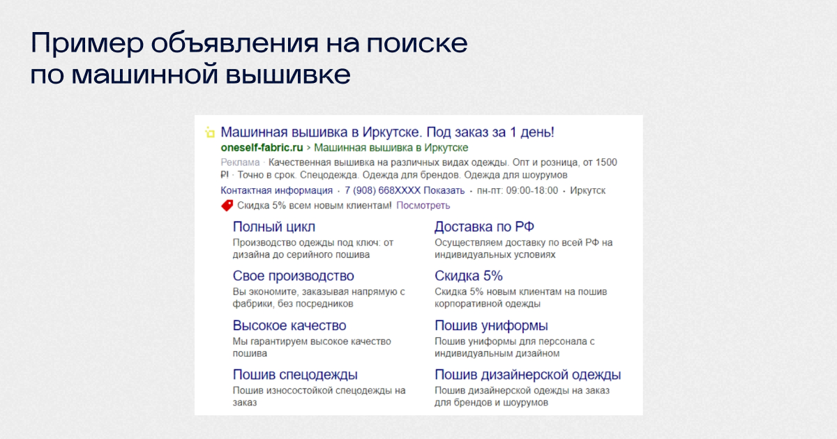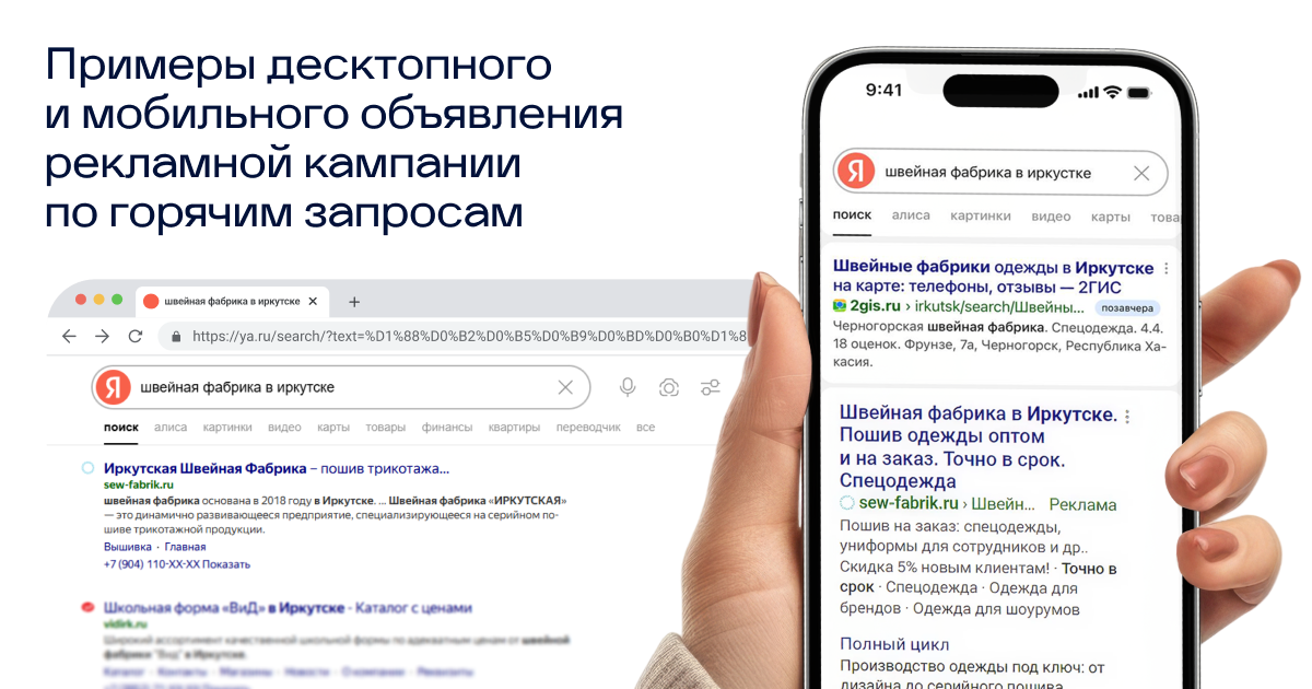 - Поисковые кампании по «горячим» запросам (швейная фабрика Иркутск, пошив униформы).