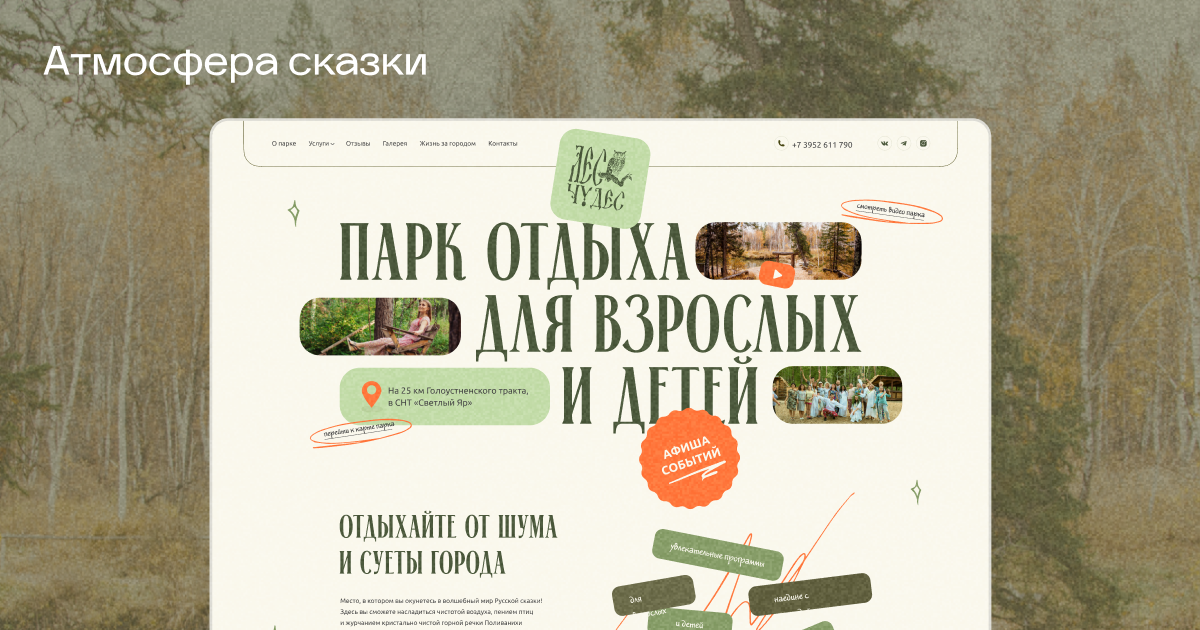 Разработали атмосферный лендинг для парка отдыха в стиле русской сказки. Отказались от скучных списков услуг в пользу интерактивной карты парка с SVG и Canvas-анимацией (шелест листьев, мерцание огоньков). Пользователи «гуляют» по сайту и оставляют заявки прямо из контекста конкретной локации.