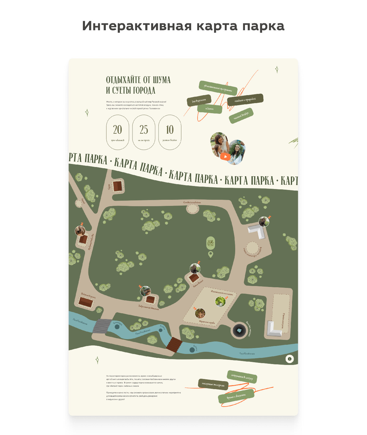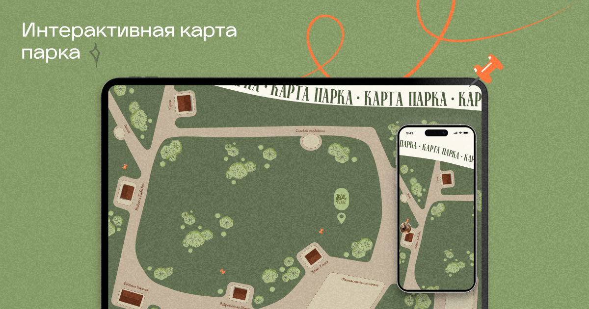 Мы нарисовали стилизованную карту маршрутов парка. Теперь пользователь не читает списки, а виртуально «гуляет» по маршруту, кликая на локации с названиями и живыми фотографиями.