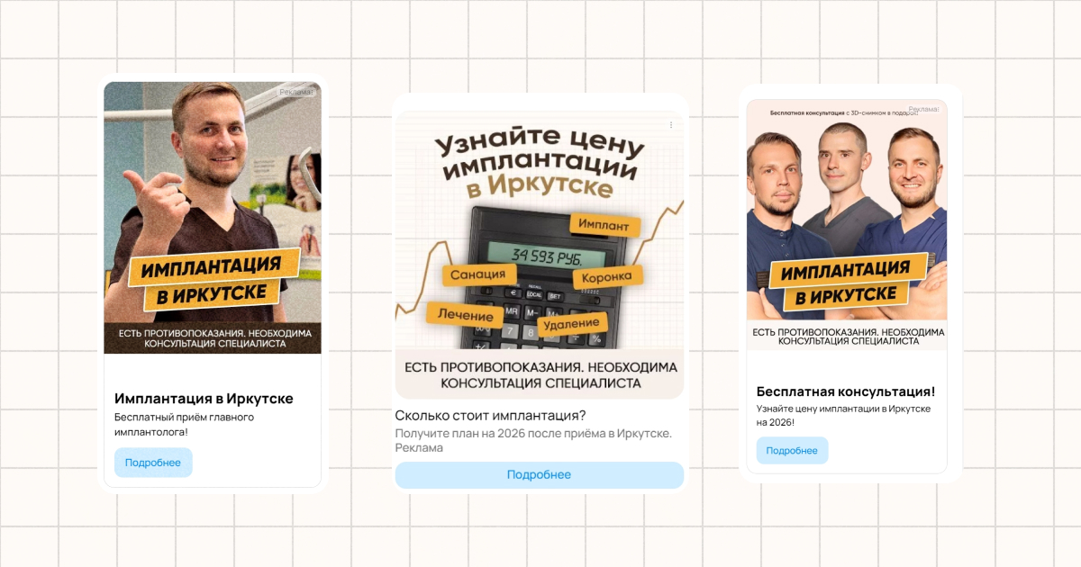 Цель: Запустить рекламную кампанию на новой для ниши площадке (одними из первых в регионе), обеспечить стабильный поток качественных заявок на имплантацию и добиться высокой окупаемости.