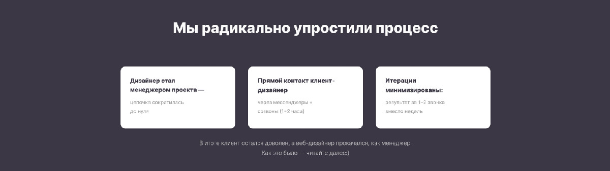 В предыдущих проектах мы столкнулись с препятствием — многоступенчатыми согласованиями. Идея клиента проходила через менеджера, дизайнера, верстальщика, из-за чего результат постепенно отдалялся от изначальной концепции. Это было похоже на игру в «сломанный телефон».