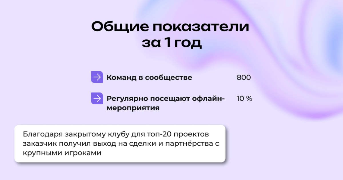 За этими цифрами — конкретные результаты для участников: партнёрства, коллаборации, новые клиенты и бизнес-возможности. Один из примеров — кофаундинг крупного проекта и несколько международных коллабораций, которые выросли из знакомств внутри комьюнити.