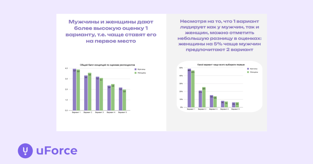 Один макет вышел в лидеры во всех сегментах — результат не зависел ни от пола, ни от географии респондентов. Это дало клиенту однозначный ответ без необходимости взвешивать компромиссы между группами. Дополнительно собрали комментарии с аргументацией выбора — это дало качественный слой поверх цифр.