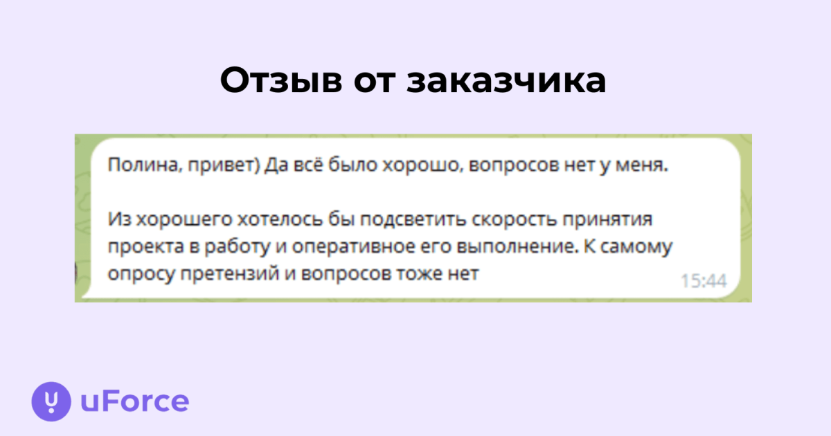 Из хорошего хотелось бы подсветить скорость принятия проекта в работу и оперативное его выполнение. К самому опросу претензий и вопросов тоже нет.