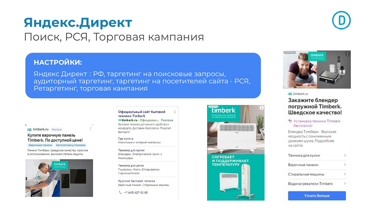 Мы использовали таргетинг на поисковые запросы, аудитории, запустили ретаргетинговые и торговые кампании. Это позволило нам охватить как можно больше потенциальных клиентов.