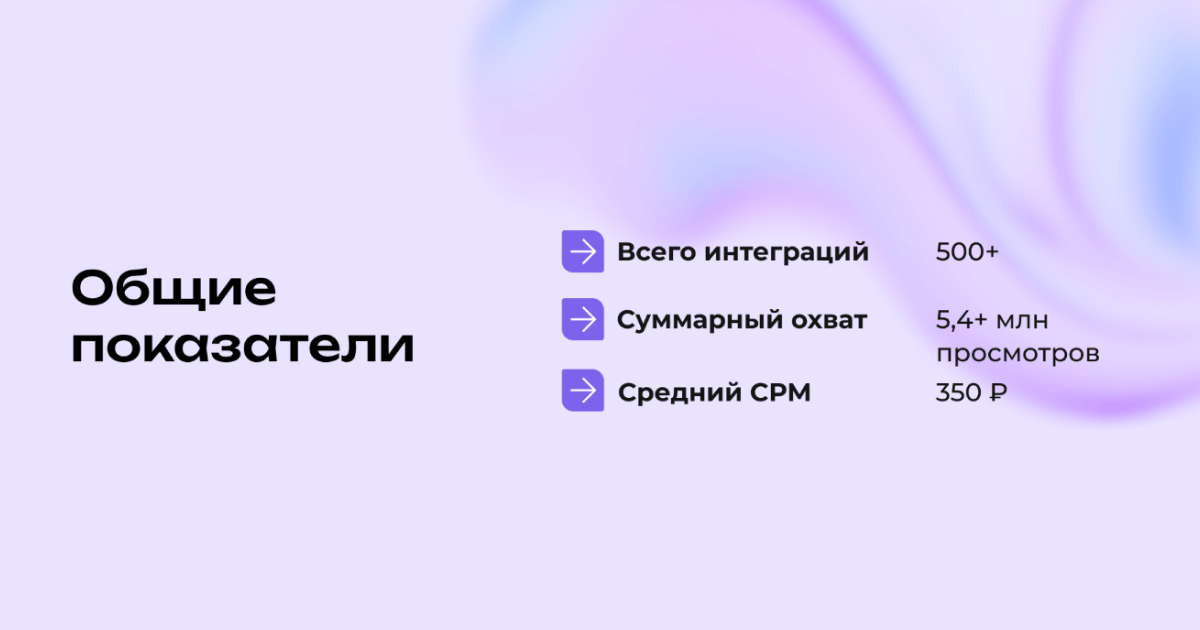 За период работы провели 500+ интеграций силами 100+ блогеров. Суммарный охват превысил 5,4 миллиона, CPM составил 350 рублей.