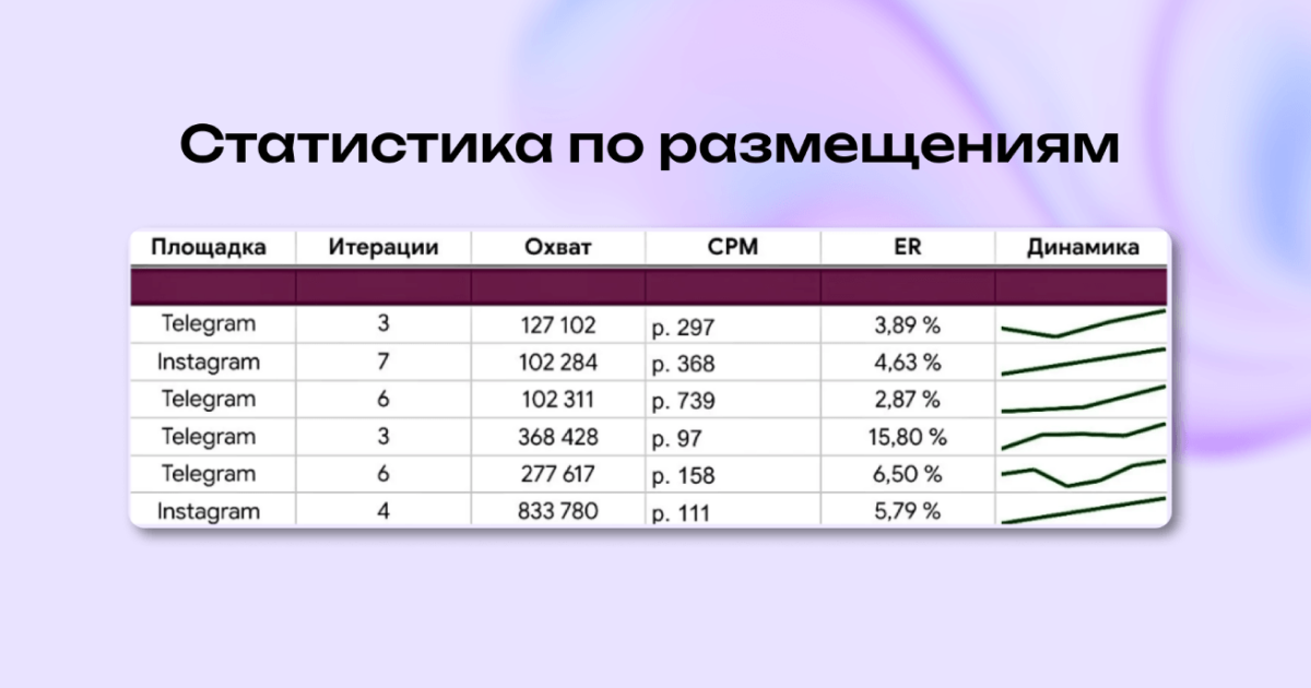 - еженедельная аналитика по ER, CPM и ROI с оптимизацией.