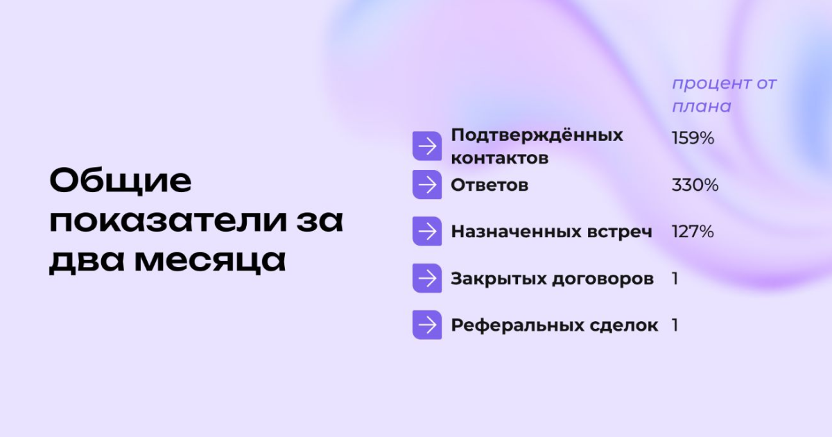 За 2 месяца мы провели 2 600+ касаний через LinkedIn и email, получили 129 ответов и 19 встреч. Результаты кампании превысили KPI и привела к 2 сделкам. Ключевой фактор — сегментация и персонализация.