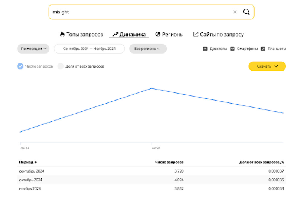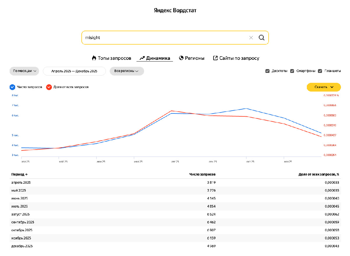 Параллельно вырос интерес к бренду в Wordstat: пик запросов «misight» совпал с периодом активного размещения.