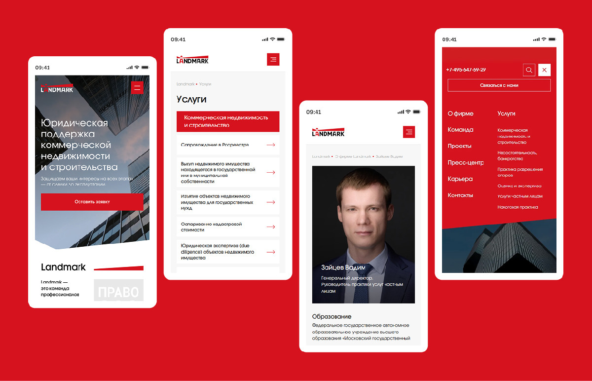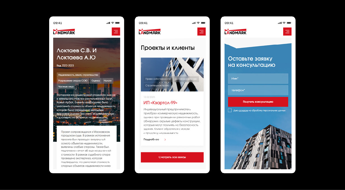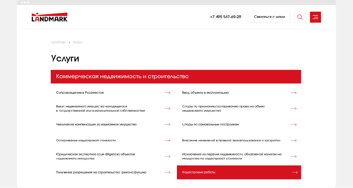 - B2B-позиционирование: Дизайн блоков и подача кейсов подтверждают высокий статус Landmark на рынке коммерческой недвижимости.