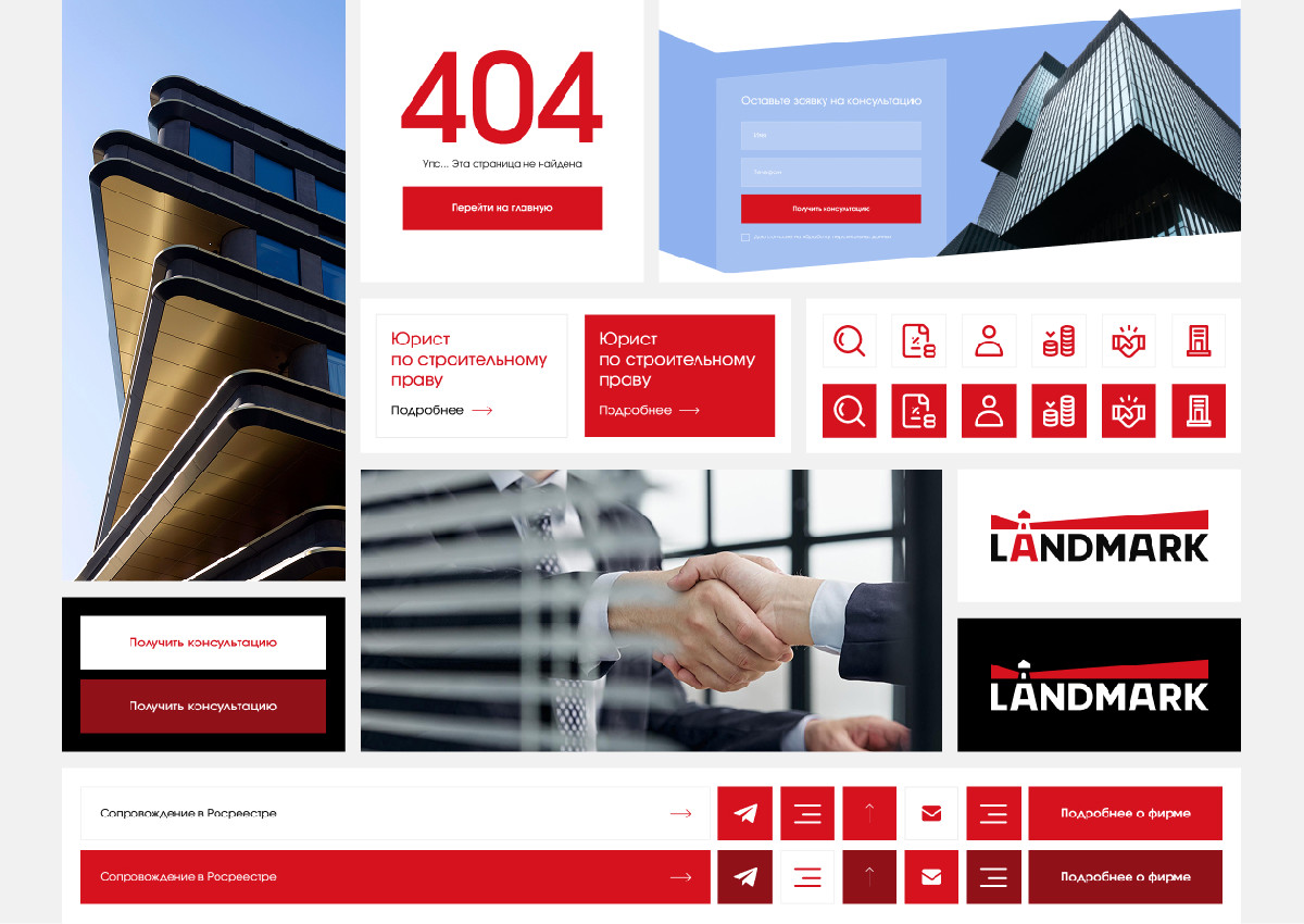 Геометрия бренда. Все кнопки, плашки и формы наследуют строгие углы из нового логотипа Landmark. Это обеспечивает бесшовный опыт и целостность восприятия бренда.