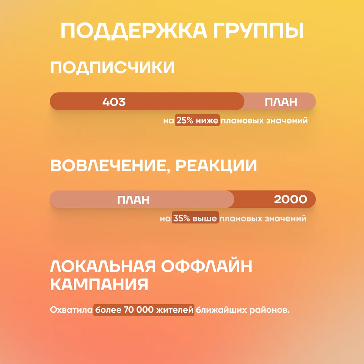 Причины невыполнения KPI — сообщетсво было практически пустым и группа развивалась с нуля. Изначально цена за 1 подписчика доходила до очень высоких сумм, что не позволяло выполнять план. Тем не менее, благодаря усилиям нашей команды SMM и оптимизации стратегий, мы смогли выйти на приемлемую цену за подписчика и постепенно улучшить показатели.