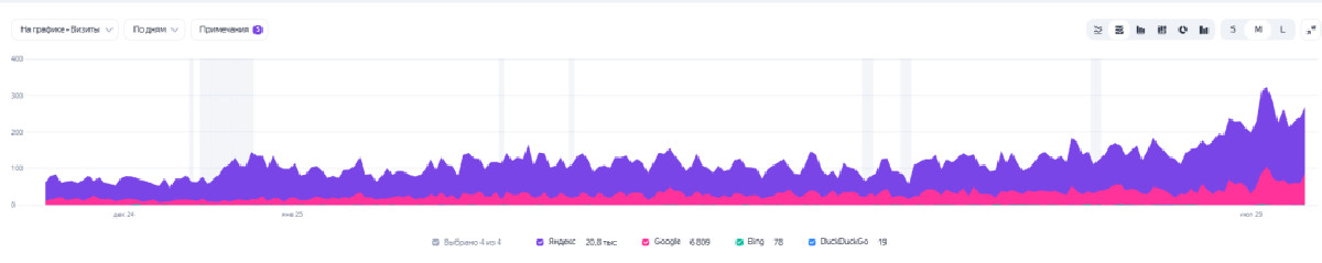 Благодаря тому, что мы придумали, как изменить сайт, не внося правки в структуру, клиент начал получать трафик из поисковиков. Уже в феврале 2025 года на ресурсе было 3 547 посещений в месяц, в июле – 5 943. Это позволило клиенту получать лиды без ежедневных вложений в рекламу, например, в Директе или ВК. Даже если прямо сейчас остановить SEO-работы, сайт еще долго будет приносить заявки.