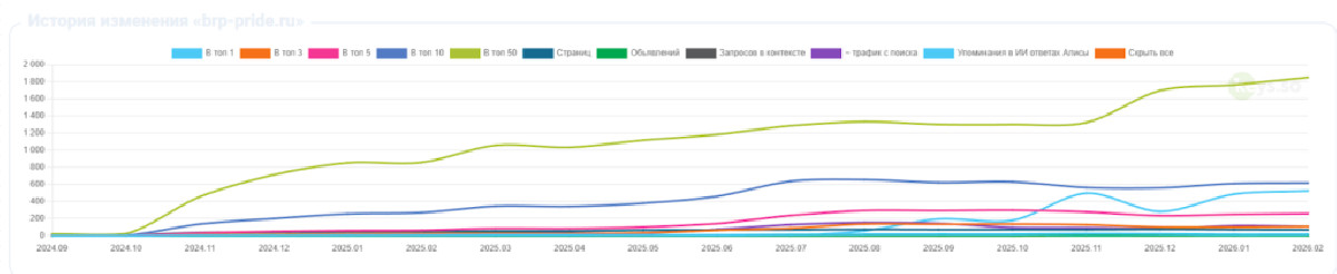 BRP ЦЕНТР ПРАЙД – один из крупнейших монобрендовых салонов BRP в России. В ассортименте – снегоходы, квадроциклы и экипировка для любителей риска. Клиент обратился в агентство SEO Интеллект в июле 2024 года с абсолютно новым сайтом, на котором не была проведена оптимизация под поисковые системы. Задача: увеличить объем органического трафика на сайт.
