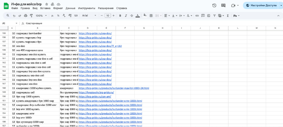 Первым шагом оптимизации стало формирование семантического ядра. Поскольку изначально сайт был запущен без учета поисковых запросов, нам необходимо было понять, как пользователи ищут технику BRP. А далее на этой основе скорректировать структуру разделов, доработать карточки моделей и наполнить контент релевантными формулировками.