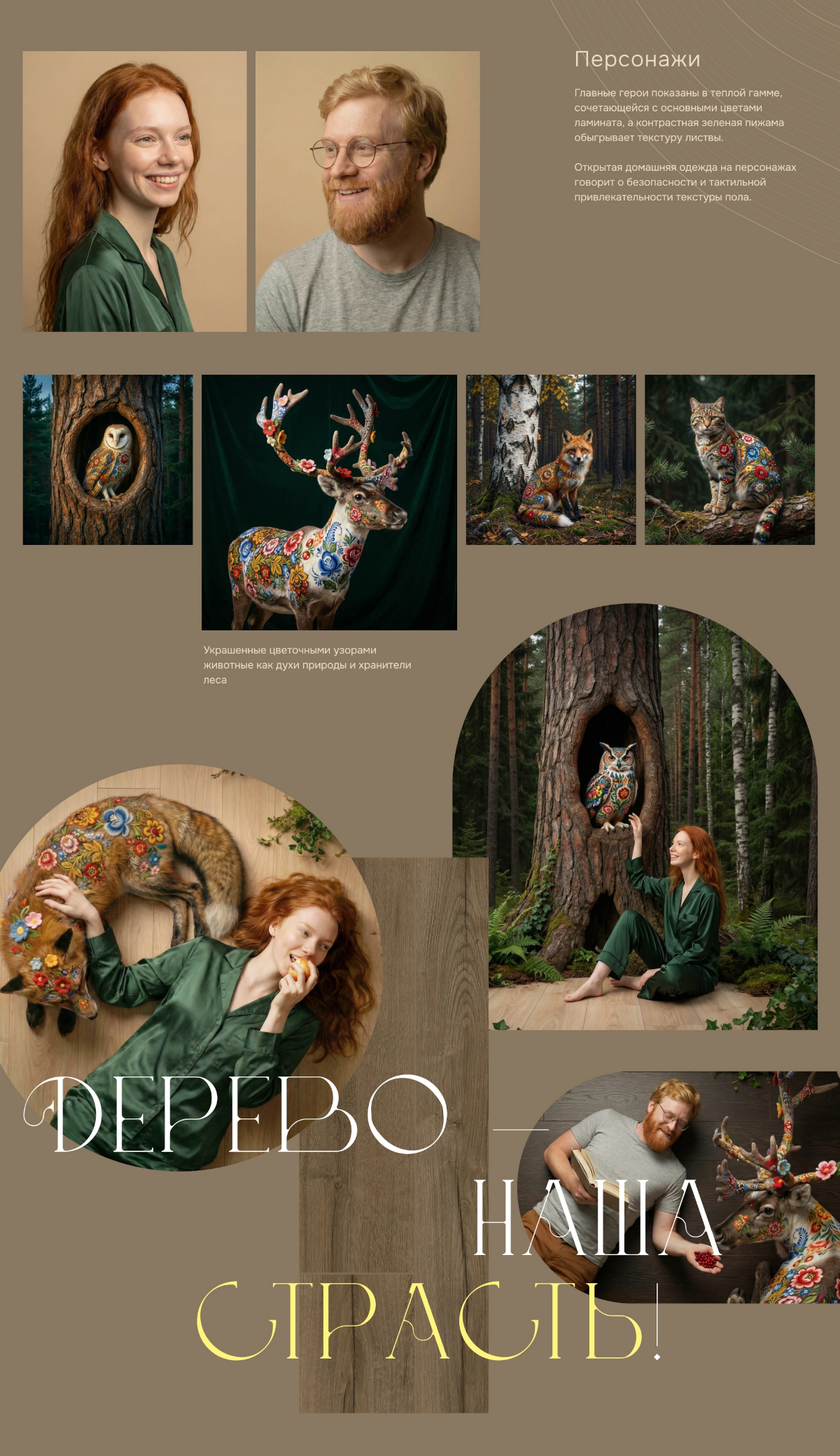 Визуалы изображают людей – семьи, влюбленные пары, дети – в гармонии с природой, но при этом находящихся в уютных интерьерах, созданных благодаря напольным покрытиям Swiss Krono. Это и фантазийные леса, где пол плавно переходит в поляну, и животные с фантазийными цветочными узорами, подчеркивающие природное происхождение, тактильную теплоту и красоту материала. Особое внимание было уделено созданию главных персонажей, чьи лица и эмоции вызывают доверие, но при этом сами сцены были достаточно необычны, чтобы приковать взгляд и "зацепить" зрителя.