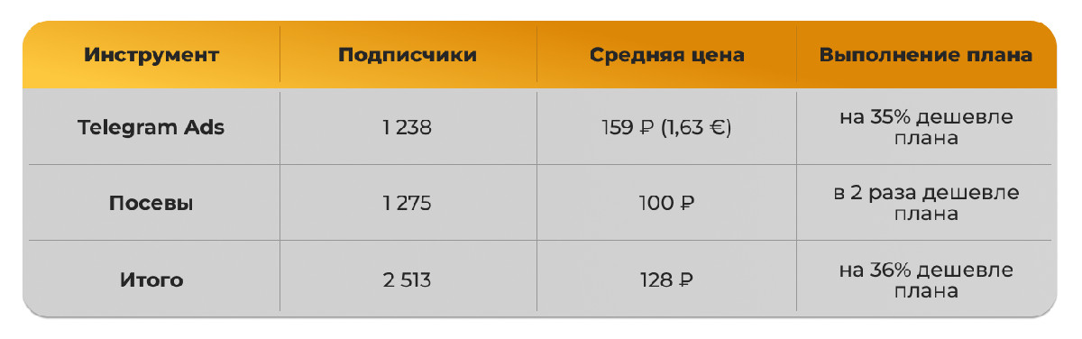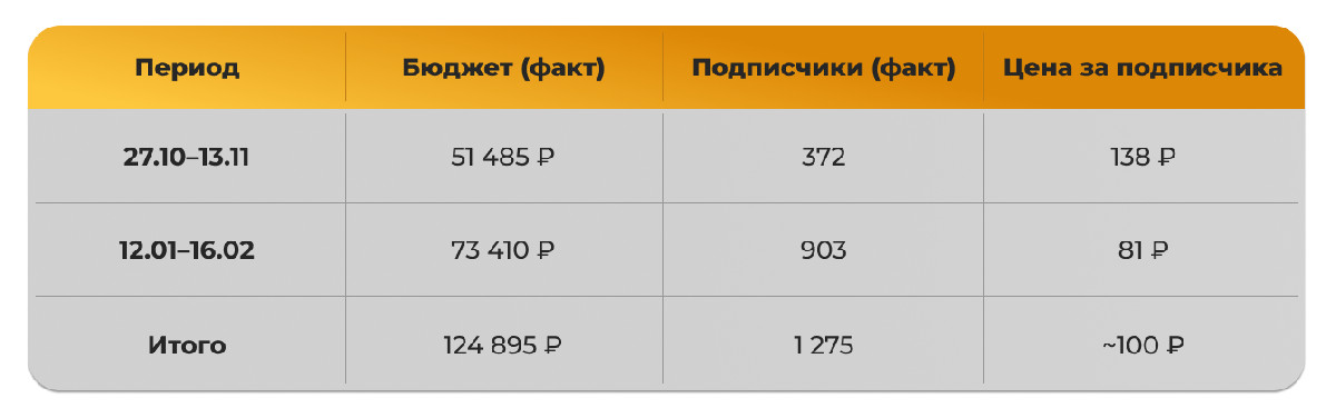 В результате за 5 месяцев привлекли 2 513 подписчиков по средней цене 128 ₽, что на 36% дешевле плана.