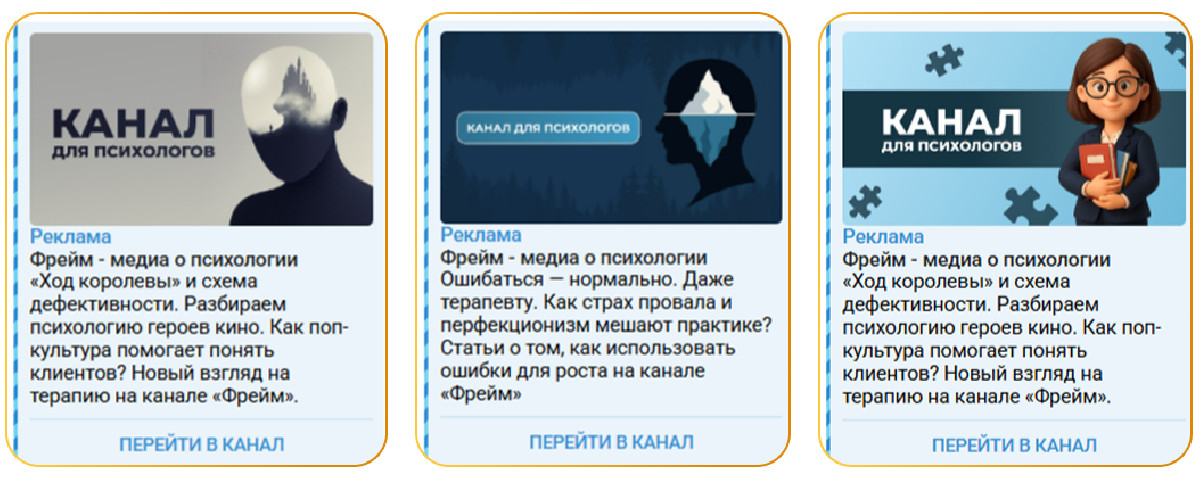 Telegram Ads (Работа с конкурентами): Отобрали каналы прямых конкурентов. Там аудитория уже «теплая" — она интересуется современной психологией, но может быть не лояльна к конкретному бренду. Мы размещались там, чтобы перехватить интерес.