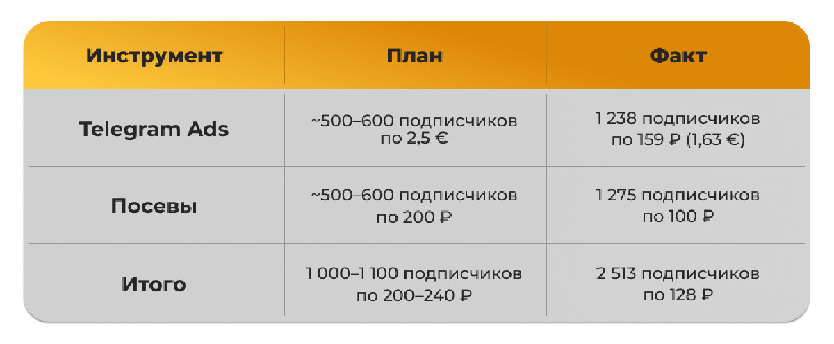 Итог: 2 513 подписчиков по 128 ₽ — это фундамент для развития медиа-канала и потенциальной монетизации в будущем.