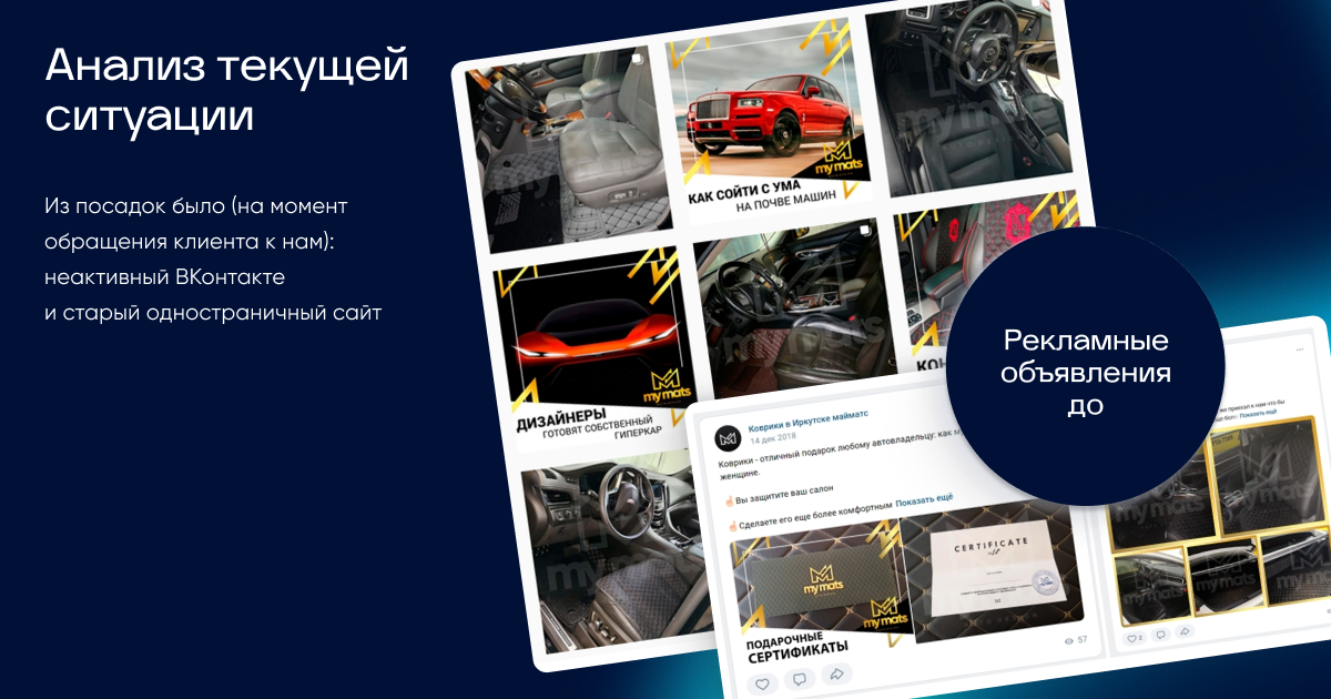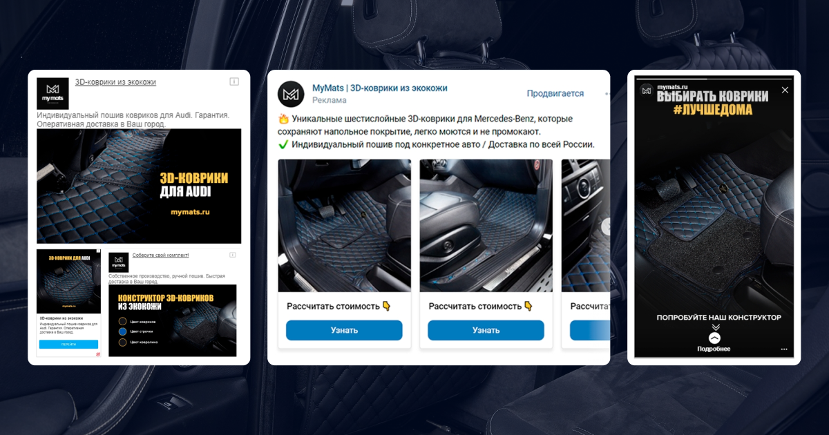 Продвижение производителя 3D-ковриков MyMats в соцсетях. Разработали интерактивный конструктор, сузили сегментацию до владельцев конкретных марок авто. Снизили цену лида с 550 до 48 руб., увеличили конверсию сайта на 19% и помогли масштабировать продажи на новые города.