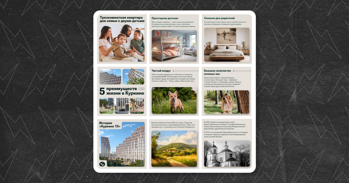 - Уникальность района и история Куркино. Раскрывали характер места, его локальные особенности, прошлое и настоящее, чтобы усилить ощущение «я хочу квартиру именно здесь».
