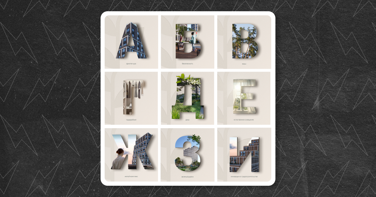 Сменили фокус. Если дом пока существует в будущем, это не значит, что нельзя говорить о нем уже сейчас. Мы показывали и то, что окружает проект сегодня, и те сценарии и преимущества, которые появятся вместе с домом. Например, ввели рубрику «Азбука района». Формат простой, но цепкий: каждая буква — это либо фишка будущего ЖК, либо особенность района, в котором он строится.