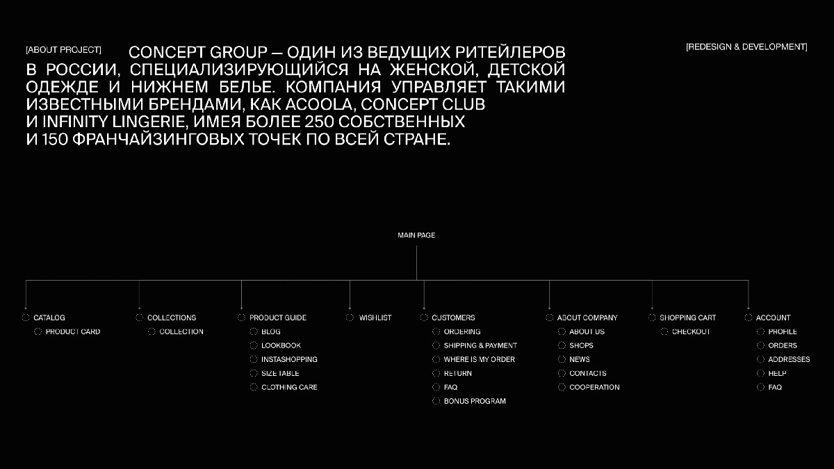 Concept Group — крупный российский fashion-ритейлер, объединяющий бренды Acoola, Concept Club и Infinity Lingerie. Компания управляет более чем 400 магазинами и активно развивает онлайн-направление. На фоне быстрого роста e-commerce в 2024 году возникла необходимость качественно обновить цифровое представление брендов.
