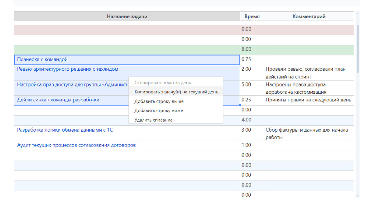 Для упрощения подготовки к планеркам внедрена функция «Черновики». Сотрудники могут составить список задач на день без указания часов, а затем в один клик скопировать готовый план с группировкой по проектам в чат для дейли. Встроенный визуальный контроль наглядно подсвечивает выходные дни красным цветом, а полностью отработанные дни (от 8 часов) автоматически отмечает зеленым.