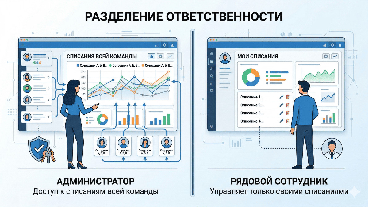 Централизация учета требует контроля, учитывающего субординацию бизнеса. В базовой версии роли строго регламентированы: рядовой сотрудник управляет только своими задачами, а администратор видит списания всей команды. У руководства появился инструмент управления аномалиями: администратор может принудительно остановить запущенный таймер уволенного сотрудника или внести забытые часы.