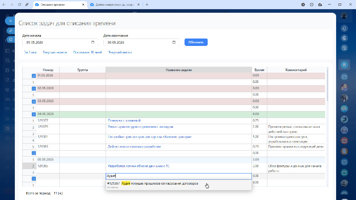 Мы внедрили наглядную таблицу, где все записи сгруппированы по датам, объединив процессы в одном окне. Ввод часов происходит прямо в строке и сохраняется автоматически без перезагрузок. Пользователям доступен поиск задач с клавиатуры, drag-and-drop перенос записей и автоматическая конвертация: можно указывать время в дробях (1,2) или минутах (0:15) — система сама переведет их в системный формат.