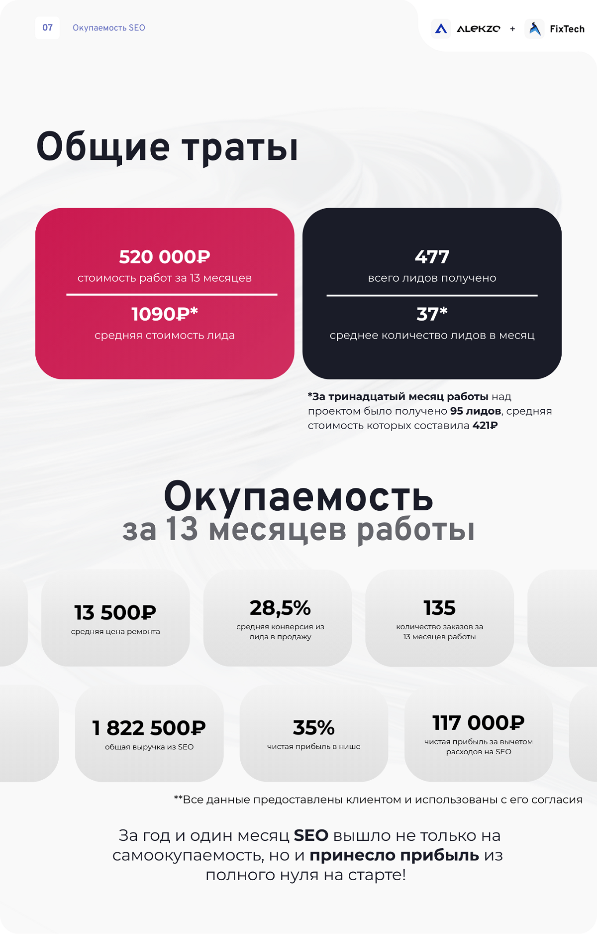 За время работы над проектом клиентом было потрачено 520 000 RUB (напоминаю, что проект - на белорусский рынок, с немного другими бюджетами, в отличие от Москвы и России в целом) + это наш старый клиент, для которого мы были готовы вложиться больше, чем нужно, чтобы в дальнейшем работать на более выгодных для себя условиях.